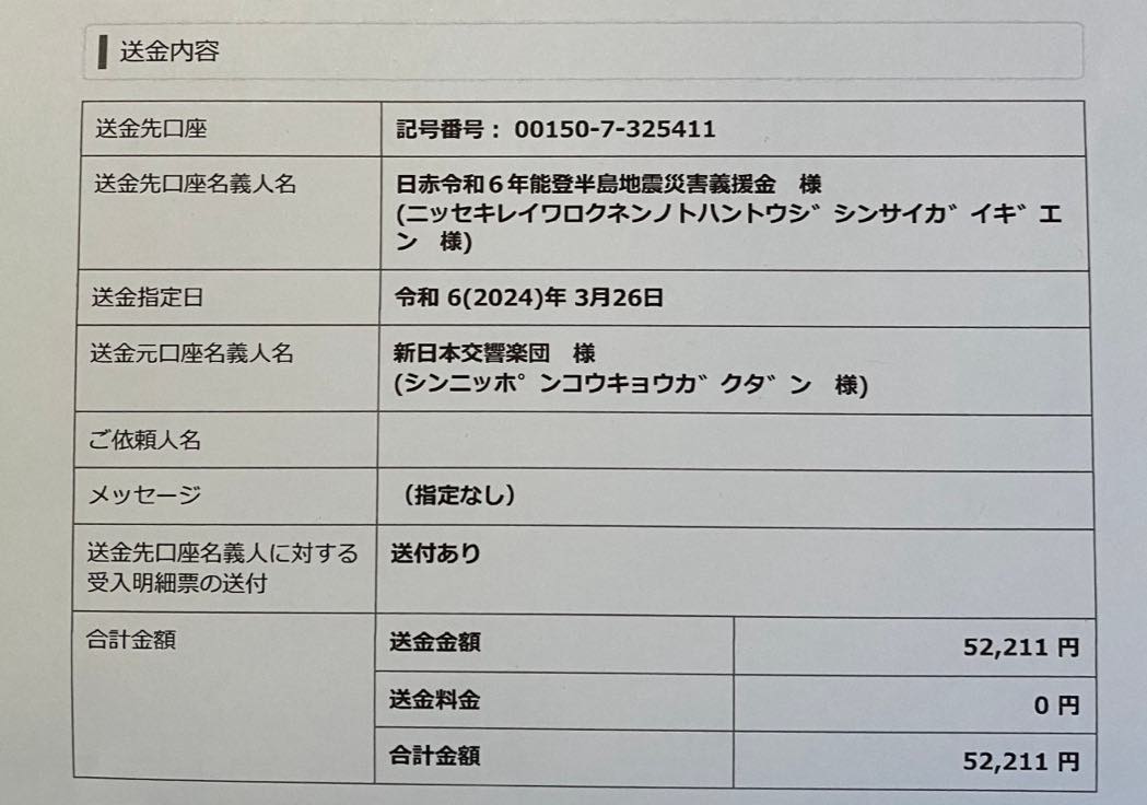 演奏会会場での能登半島地震への義援金へのご協力、誠にありがとうございました。